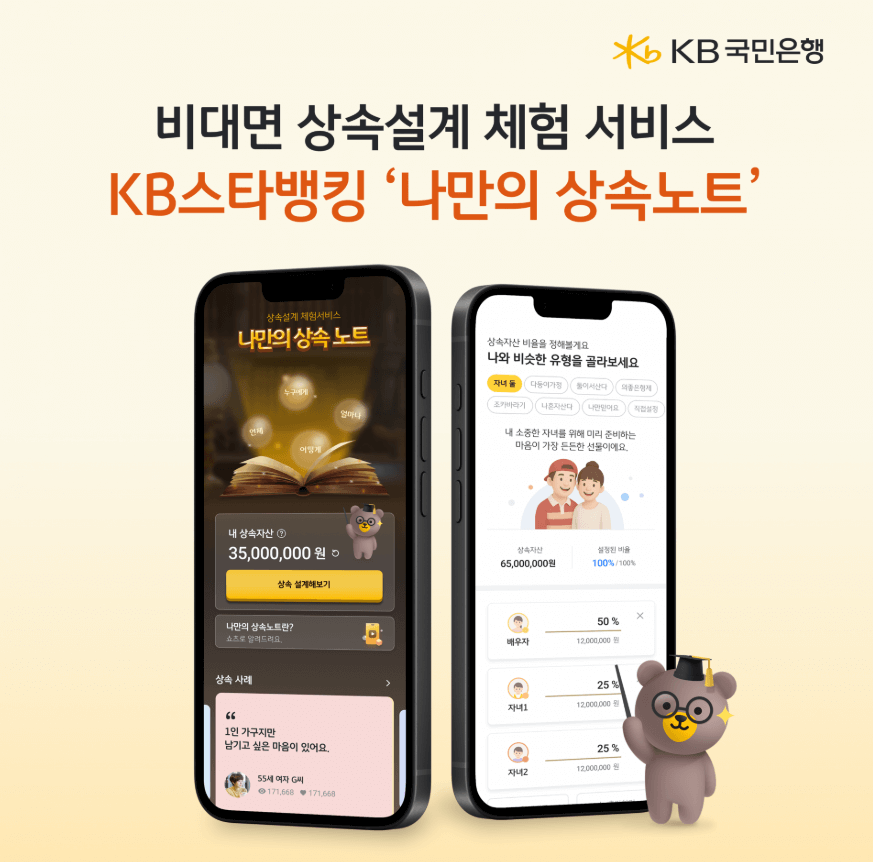 KB국민은행 나만의 상속노트는 직접 상속 시나리오를 체험하고, 가족 상황에 맞게 자산 이전 계획을 세울 수 있는 디지털 서비스입니다. 초고령사회로 진입하면서 상속에 대한 고민이 커진 요즘, 비대면으로 언제든지 상속설계를 해볼 수 있다는 점에서 큰 주목을 받고 있어요.